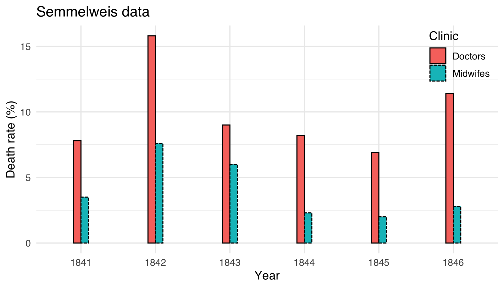 ### Numerical summaries for categorical samples ### Barplots ### Pieplots ### Semmelweis quasi-experiment --- template: inter-slide name: num-sum-cat-samples ## Numerical summaries for categorical samples --- ### Counts For qualitative samples, summary statistics consists of _counts_: for each modality, we record the _number of occurences_ or _frequency_