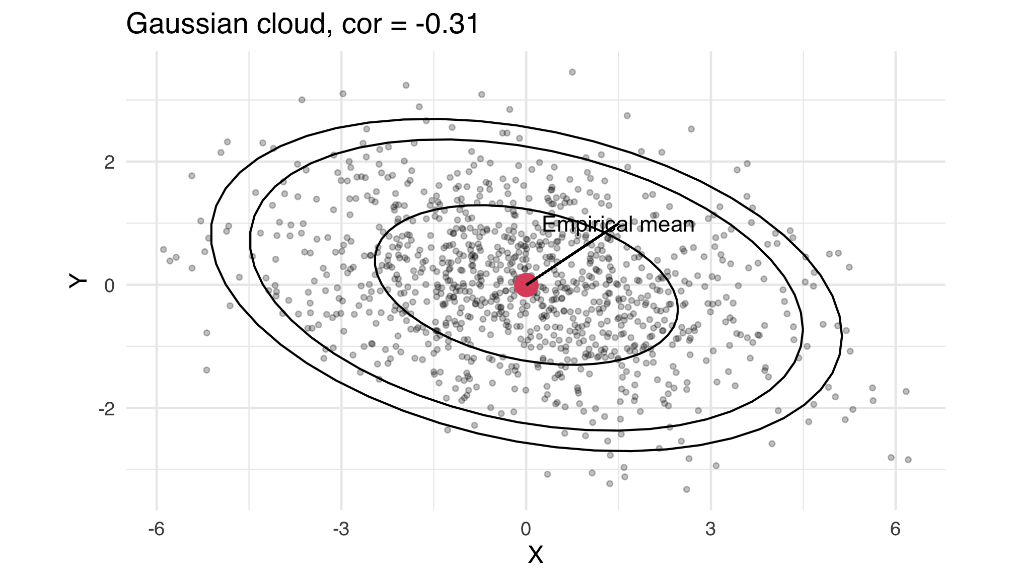 .panelset[ .panel[.panel-name[Simulation] We build an artificial bivariate sample, by first building a covariance matrix `COV` (it is randomly generated). Then we build a bivariate normal sample `s` of length `n` and turn it into a dataframe `u`. The dataframe is then fed to `ggplot`. ```r set.seed(1515) # for the sake of reproducibility n <- 100 V <- matrix(rnorm(4, 1, 1), nrow = 2) COV <- V %*% t(V) # a random covariance matrix, COV is symmetric and SDP s <- t(V %*% matrix(rnorm(2 * 10 * n), ncol=10*n)) u <- tibble(X=s[,1], Y=s[, 2]) # a bivariate normal sample emp_mean <- as_data_frame(t(colMeans(u))) ``` ``` ## Warning: `as_data_frame()` was deprecated in tibble 2.0.0. ## Please use `as_tibble()` instead. ## The signature and semantics have changed, see `?as_tibble`. ``` ```r p_scatter_gaussian <- ggplot(u, aes(x=X, y=Y)) + geom_point(alpha=.5, size=1) + geom_point(data=emp_mean, color=2, size=5) + coord_fixed() + ggtitle(stringr::str_c("Gaussian cloud, cor = ", round(cor(u$X, u$Y), 2), sep="")) p_scatter_gaussian ``` ] .panel[.panel-name[Numerical Summary] - Mean vector (Empirical mean) ```r t(colMeans(u)) %>% knitr::kable(digits = 3, col.names = c("$\\overline{X_n}$", "$\\overline{Y_n}$")) ``` <table> <thead> <tr> <th style="text-align:right;"> `\(\overline{X_n}\)` </th> <th style="text-align:right;"> `\(\overline{Y_n}\)` </th> </tr> </thead> <tbody> <tr> <td style="text-align:right;"> 0.004 </td> <td style="text-align:right;"> -0.004 </td> </tr> </tbody> </table> - Covariance matrix (Empirical covariance matrix) ```r cov(u) %>% as.data.frame() %>% knitr::kable(digits = 3) ``` <table> <thead> <tr> <th style="text-align:left;"> </th> <th style="text-align:right;"> X </th> <th style="text-align:right;"> Y </th> </tr> </thead> <tbody> <tr> <td style="text-align:left;"> X </td> <td style="text-align:right;"> 4.370 </td> <td style="text-align:right;"> -0.706 </td> </tr> <tr> <td style="text-align:left;"> Y </td> <td style="text-align:right;"> -0.706 </td> <td style="text-align:right;"> 1.212 </td> </tr> </tbody> </table> ] .panel[.panel-name[Plot]  ] ] --- class: center, middle, inverse ## Qualitative and quantitative variables --- ### Back to