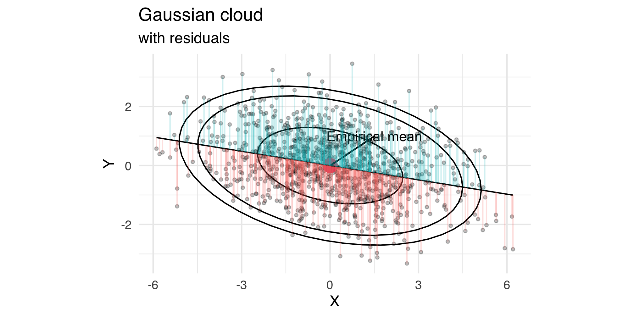 If the sample were standardized, that is, if `\(X\)` (resp. `\(Y\)`) were divided by `\(\sigma_X\)` (resp. `\(\sigma_Y\)`), the slope of the regression line would be the correlation coefficient --- ### Overplotting the Gaussian cloud .left-column[ - The _slope_ and _intercept_ can be computed from the sample summary (empirical mean and covariance matrix) - In higher dimension, coefficients are from `lm(...)` ] .right-column[ <img src="cm-3-EDA_files/figure-html/unnamed-chunk-18-1.png" width="504" /> ] --- ### `lm(formula, data)` ```r mod <- lm(formula=Y ~ X, data=u) mod %>% summary() ``` ``` ## ## Call: ## lm(formula = Y ~ X, data = u) ## ## Residuals: ## Min 1Q Median 3Q Max ## -3.0168 -0.7106 -0.0079 0.7294 3.5773 ## ## Coefficients: ## Estimate Std. Error t value Pr(>|t|) ## (Intercept) -0.003685 0.033145 -0.111 0.911 ## X -0.161562 0.015864 -10.184 <2e-16 *** ## --- ## Signif. codes: 0 '***' 0.001 '**' 0.01 '*' 0.05 '.' 0.1 ' ' 1 ## ## Residual standard error: 1.048 on 998 degrees of freedom ## Multiple R-squared: 0.09415, Adjusted R-squared: 0.09324 ## F-statistic: 103.7 on 1 and 998 DF, p-value: < 2.2e-16 ``` --- ### Residuals .panelset[ .panel[.panel-name[Residuals] The _residuals_ are the prediction errors `\(\left(y_i - \widehat{a}x_i - \widehat{b}\right)_{i\leq n}\)` Residuals play a central role in _regression diagnostic_ The `Residual Standard Error`, is the square root of the normalized sum of squared residuals: `$$\frac{1}{n-2}\sum_{i=1}^n \left(y_i - \widehat{a}x_i - \widehat{b}\right)^2$$` The normalization coefficient is the number of rows `\(n\)` diminished by the number of adjusted parameters (the so-called _degrees of freedom_)