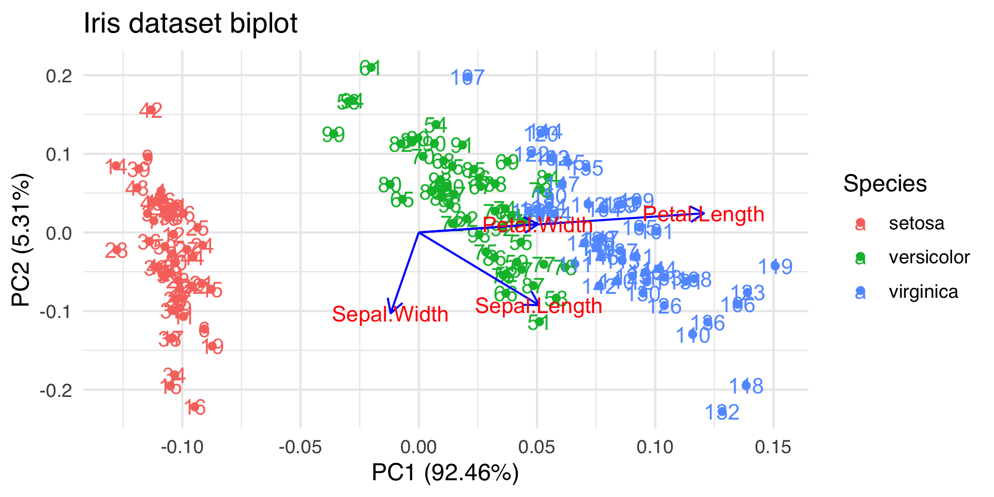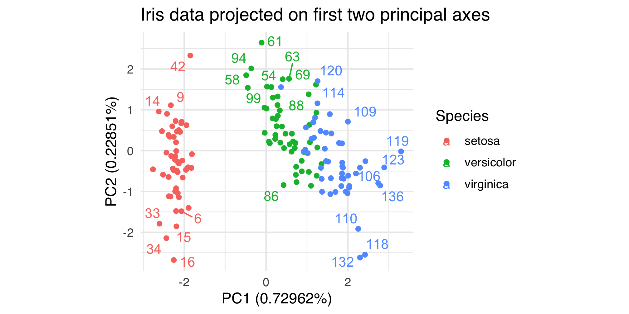 Some datasets have non-numerical columns. Such columns are not used when computing the SVD that underpins PCA But non-numerical columns may be incorporated into PCA visualization ??? When PCA is used as a feature engineering device to prepare the dataset for regression, supervised classification, clustering or any other statistical/machine learning treatment, visualizing the interplay between non-numerical columns and the numerical columns constructed by PCA is crucial --- ### Iris flower dataset A showcase for Principal Component Analysis .fl.w-60.pa2.f6[ > The Iris flower data set or Fisher's Iris data set is a multivariate data set introduced by Ronald Fisher in 1936. Edgar Anderson collected the data to quantify the morphologic variation of Iris flowers of three related species. Two of the three species were collected in the Gaspé Peninsula "all from the same pasture, and picked on the same day and measured at the same time by the same person with the same apparatus" > The data set consists of 50 samples from each of three species of Iris (Iris setosa, Iris virginica and Iris versicolor). Four features were measured from each sample: the length and the width of the sepals and petals, in centimeters .tr[[Wikipedia](https://en.wikipedia.org/wiki/Iris_flower_data_set)]
