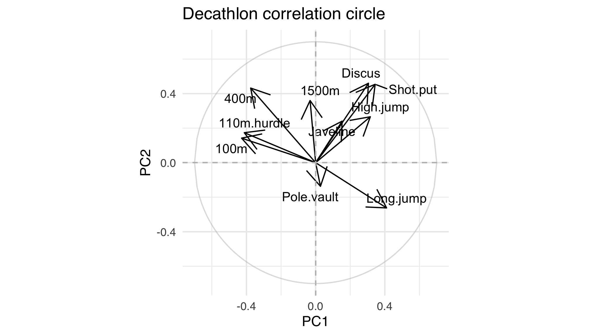 We center and standardize columns, and then perform a change of basis ] ] .panel[.panel-name[Plots] ```r p + geom_boxplot() ; p + geom_violin() ``` <img src="cm-6-EDA_files/figure-html/unnamed-chunk-25-1.png" width="50%" /><img src="cm-6-EDA_files/figure-html/unnamed-chunk-25-2.png" width="50%" /> ] ] --- ### Two packages Several packages handle the field of factorial analysis .fl.w-50.pa2[ #### `ADE4` + 2002-... + Duality diagrams: `dudi.pca` + Ecology oriented + [ADE4 Homepage](http://pbil.univ-lyon1.fr) ] .fl.w-50.pa2[ #### `FactoMineR` + 2003-... + `Factoshiny` + `FactoExtra` + `FactoInvestigate` + A nice book + A MOOC ] --- ### FactoMineR homepage <iframe src="http://factominer.free.fr" height="400" width="800" title="FactoMineR"></iframe> --- ### FactoMineR on PCA <iframe src="http://factominer.free.fr/factomethods/principal-components-analysis.html" height="400" width="800" title="FactoMineR"></iframe> --- ### FactoMineR : scatterplot and correlation circle ```r iris %>% dplyr::select(where(is.numeric)) %>% FactoMineR::PCA() %>% plot(graph.type="ggplot", title="Iris data with FactoMineR") ``` <img src="cm-6-EDA_files/figure-html/facto-plot-1.png" width="50%" /><img src="cm-6-EDA_files/figure-html/facto-plot-2.png" width="50%" /><img src="cm-6-EDA_files/figure-html/facto-plot-3.png" width="50%" /> --- ### Revisiting Decathlon data .panelset[ .panel[.panel-name[Code] Ad hoc transformation of running scores: average speed matters ```r decathlonTime <- mutate(decathlon, `100m` = 100/`100m`, `400m` = 400/`400m`, `110m.hurdle` = 110/`110m.hurdle`, `1500m` = 1500/`1500m`) # rownames(decathlonTime) <- rownames(decathlon) PCAdecathlontime <- PCA(decathlonTime[,1:10], graph = FALSE) ``` ] .panel[.panel-name[Plot] ```r factoextra::fviz_pca_ind(PCAdecathlontime, repel = TRUE) ``` ``` ## Warning: ggrepel: 2 unlabeled data points (too many overlaps). Consider ## increasing max.overlaps ``` ```r factoextra::fviz_pca_var(PCAdecathlontime, repel = TRUE) ``` <img src="cm-6-EDA_files/figure-html/unnamed-chunk-27-1.png" width="50%" /><img src="cm-6-EDA_files/figure-html/unnamed-chunk-27-2.png" width="50%" /> ] ] ??? When inspecting `decathlon` some columns are positively correlated with column `Points`, others are not. The negatively correlated columns contain running races times. In order to handle all scores in an homogenous way, running races scores are converted into average speeds. The larger, the better. The correlation circle becomes more transparent: columns can be clustered into three subsets: - running races and long jump, p - puts, javeline and high jump - 1500m and pole vault which are poorly correlated with first two principal components We can do it with `tidyverse` ```r decathlonTime[, 1:10] %>% prcomp(scale.=TRUE) -> pc_decathlonTime share_variance <- round(broom::tidy(pc_decathlonTime, matrix="pcs")[["percent"]], 2) pc_decathlonTime %>% broom::augment(data=decathlonTime) %>% ggplot() + aes(x=.fittedPC1, y=.fittedPC2) + aes(color=Points, label=.rownames) + geom_point() + geom_text_repel() + xlab(paste("Dim1 (", share_variance[1] ,"%)", sep="")) + ylab(paste("Dim2 (", share_variance[2] ,"%)", sep="")) ``` ``` ## Warning: ggrepel: 2 unlabeled data points (too many overlaps). Consider ## increasing max.overlaps ``` ```r radius <- sqrt(broom::tidy(pc_decathlonTime, matrix="pcs")[["cumulative"]][2]) pc_decathlonTime[["rotation"]] %>% as_tibble(rownames="Name") %>% ggplot() + aes(x=PC1, y=PC2, label=Name) + geom_segment(xend=0, yend=0, arrow = grid::arrow(ends = "first") ) + geom_text_repel() + coord_fixed() + xlim(-radius, radius) + ylim(-radius, radius) + stat_function(fun = ~ sqrt(radius^2 - .^2), alpha=.5, color="grey") + stat_function(fun = ~ - sqrt(radius^2 - .^2), alpha=.5, color="grey") + geom_segment(x = 0, y = -1, xend = 0, yend = 1, linetype = "dashed", color = "grey") + geom_segment(x = -1, y = 0, xend = 1, yend = 0, linetype = "dashed", color = "grey") + ggtitle("Decathlon correlation circle (bis)") + xlab(paste("Dim1 (", share_variance[1] ,"%)", sep="")) + ylab(paste("Dim2 (", share_variance[2] ,"%)", sep="")) ``` <img src="cm-6-EDA_files/figure-html/unnamed-chunk-28-1.png" width="50%" /><img src="cm-6-EDA_files/figure-html/unnamed-chunk-28-2.png" width="50%" /> --- template: inter-slide name: pca-dataviz ## PCA visualization in perspective --- ### PCA and the tidy approach The output of `prcomp` (or of any contender) is complex object represented by a list with five named elements: `x`, `sdev`, `rotation`, `center` `scale` In