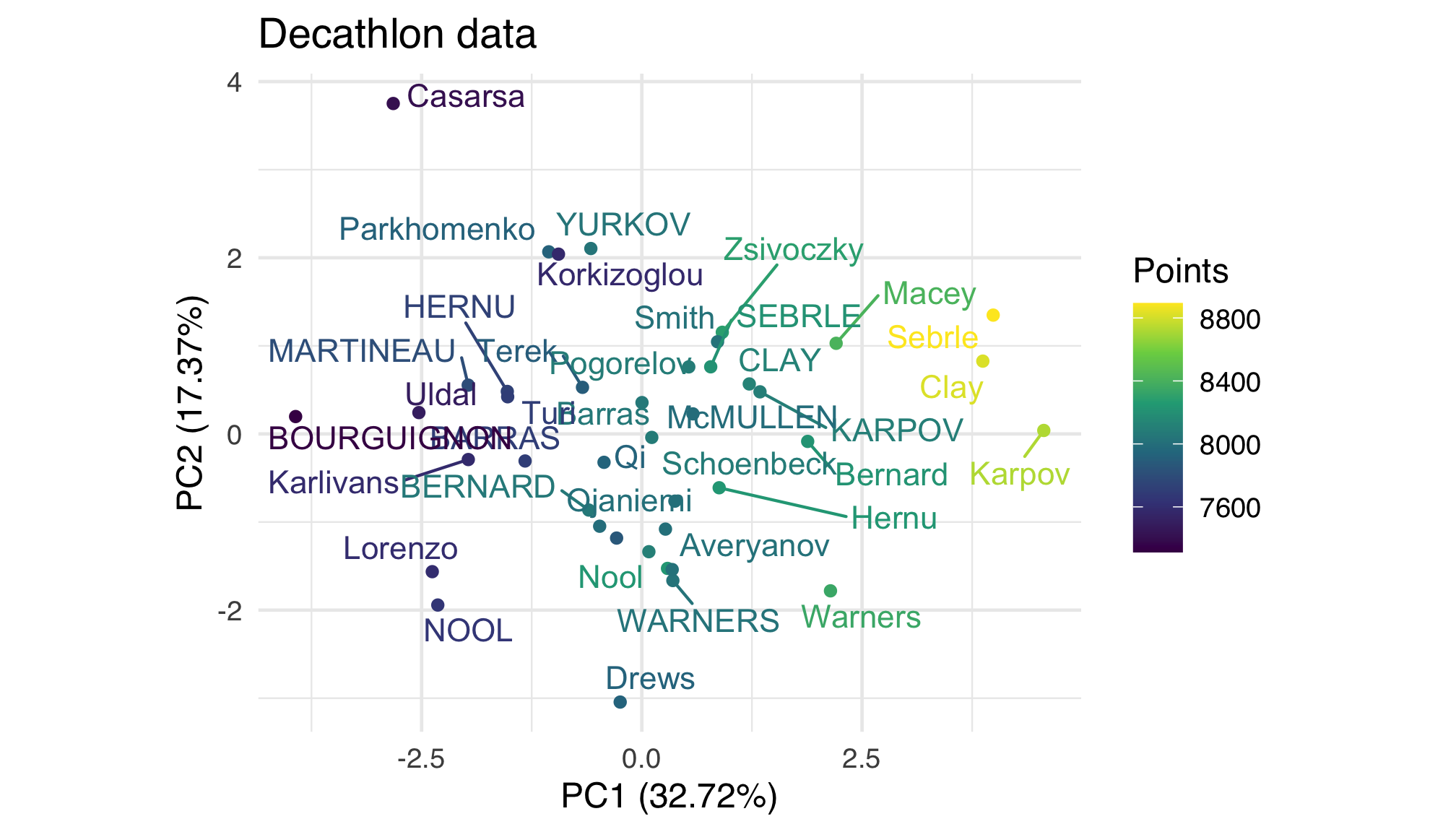 ] .fl.w-40.pa2[ <img src="./img/iris-fleur-histoire.jpeg" width="187" /> ] --- ### `USArrests` .fl.w-60.f6[ <table> <thead> <tr> <th style="text-align:left;"> </th> <th style="text-align:right;"> Murder </th> <th style="text-align:right;"> Assault </th> <th style="text-align:right;"> UrbanPop </th> <th style="text-align:right;"> Rape </th> </tr> </thead> <tbody> <tr> <td style="text-align:left;"> New Jersey </td> <td style="text-align:right;"> 7.4 </td> <td style="text-align:right;"> 159 </td> <td style="text-align:right;"> 89 </td> <td style="text-align:right;"> 18.8 </td> </tr> <tr> <td style="text-align:left;"> Mississippi </td> <td style="text-align:right;"> 16.1 </td> <td style="text-align:right;"> 259 </td> <td style="text-align:right;"> 44 </td> <td style="text-align:right;"> 17.1 </td> </tr> <tr> <td style="text-align:left;"> Kansas </td> <td style="text-align:right;"> 6.0 </td> <td style="text-align:right;"> 115 </td> <td style="text-align:right;"> 66 </td> <td style="text-align:right;"> 18.0 </td> </tr> <tr> <td style="text-align:left;"> Texas </td> <td style="text-align:right;"> 12.7 </td> <td style="text-align:right;"> 201 </td> <td style="text-align:right;"> 80 </td> <td style="text-align:right;"> 25.5 </td> </tr> <tr> <td style="text-align:left;"> Hawaii </td> <td style="text-align:right;"> 5.3 </td> <td style="text-align:right;"> 46 </td> <td style="text-align:right;"> 83 </td> <td style="text-align:right;"> 20.2 </td> </tr> <tr> <td style="text-align:left;"> Wyoming </td> <td style="text-align:right;"> 6.8 </td> <td style="text-align:right;"> 161 </td> <td style="text-align:right;"> 60 </td> <td style="text-align:right;"> 15.6 </td> </tr> <tr> <td style="text-align:left;"> Colorado </td> <td style="text-align:right;"> 7.9 </td> <td style="text-align:right;"> 204 </td> <td style="text-align:right;"> 78 </td> <td style="text-align:right;"> 38.7 </td> </tr> <tr> <td style="text-align:left;"> Arkansas </td> <td style="text-align:right;"> 8.8 </td> <td style="text-align:right;"> 190 </td> <td style="text-align:right;"> 50 </td> <td style="text-align:right;"> 19.5 </td> </tr> <tr> <td style="text-align:left;"> Minnesota </td> <td style="text-align:right;"> 2.7 </td> <td style="text-align:right;"> 72 </td> <td style="text-align:right;"> 66 </td> <td style="text-align:right;"> 14.9 </td> </tr> <tr> <td style="text-align:left;"> Ohio </td> <td style="text-align:right;"> 7.3 </td> <td style="text-align:right;"> 120 </td> <td style="text-align:right;"> 75 </td> <td style="text-align:right;"> 21.4 </td> </tr> </tbody> </table> 4 numerical columns, questionable scalings ] .fl.w-40[ <img src="cm-6-EDA_files/figure-html/unnamed-chunk-8-1.png" width="504" /> ] --- ### Decathlon .fl.w-60.f6[ <table> <thead> <tr> <th style="text-align:left;"> rowname </th> <th style="text-align:right;"> 100m </th> <th style="text-align:right;"> Long.jump </th> <th style="text-align:right;"> High.jump </th> <th style="text-align:right;"> Discus </th> <th style="text-align:right;"> Pole.vault </th> </tr> </thead> <tbody> <tr> <td style="text-align:left;"> MARTINEAU </td> <td style="text-align:right;"> 11.64 </td> <td style="text-align:right;"> 6.81 </td> <td style="text-align:right;"> 1.95 </td> <td style="text-align:right;"> 47.60 </td> <td style="text-align:right;"> 4.92 </td> </tr> <tr> <td style="text-align:left;"> McMULLEN </td> <td style="text-align:right;"> 10.83 </td> <td style="text-align:right;"> 7.31 </td> <td style="text-align:right;"> 2.13 </td> <td style="text-align:right;"> 44.41 </td> <td style="text-align:right;"> 4.42 </td> </tr> <tr> <td style="text-align:left;"> Smith </td> <td style="text-align:right;"> 10.85 </td> <td style="text-align:right;"> 6.81 </td> <td style="text-align:right;"> 1.91 </td> <td style="text-align:right;"> 49.02 </td> <td style="text-align:right;"> 4.20 </td> </tr> <tr> <td style="text-align:left;"> Sebrle </td> <td style="text-align:right;"> 10.85 </td> <td style="text-align:right;"> 7.84 </td> <td style="text-align:right;"> 2.12 </td> <td style="text-align:right;"> 48.72 </td> <td style="text-align:right;"> 5.00 </td> </tr> <tr> <td style="text-align:left;"> Casarsa </td> <td style="text-align:right;"> 11.36 </td> <td style="text-align:right;"> 6.68 </td> <td style="text-align:right;"> 1.94 </td> <td style="text-align:right;"> 48.66 </td> <td style="text-align:right;"> 4.40 </td> </tr> <tr> <td style="text-align:left;"> Qi </td> <td style="text-align:right;"> 11.06 </td> <td style="text-align:right;"> 7.34 </td> <td style="text-align:right;"> 1.97 </td> <td style="text-align:right;"> 45.13 </td> <td style="text-align:right;"> 4.50 </td> </tr> <tr> <td style="text-align:left;"> Macey </td> <td style="text-align:right;"> 10.89 </td> <td style="text-align:right;"> 7.47 </td> <td style="text-align:right;"> 2.15 </td> <td style="text-align:right;"> 48.34 </td> <td style="text-align:right;"> 4.40 </td> </tr> <tr> <td style="text-align:left;"> Zsivoczky </td> <td style="text-align:right;"> 10.91 </td> <td style="text-align:right;"> 7.14 </td> <td style="text-align:right;"> 2.12 </td> <td style="text-align:right;"> 45.62 </td> <td style="text-align:right;"> 4.70 </td> </tr> <tr> <td style="text-align:left;"> KARPOV </td> <td style="text-align:right;"> 11.02 </td> <td style="text-align:right;"> 7.30 </td> <td style="text-align:right;"> 2.04 </td> <td style="text-align:right;"> 48.95 </td> <td style="text-align:right;"> 4.92 </td> </tr> <tr> <td style="text-align:left;"> ZSIVOCZKY </td> <td style="text-align:right;"> 11.13 </td> <td style="text-align:right;"> 7.30 </td> <td style="text-align:right;"> 2.01 </td> <td style="text-align:right;"> 45.67 </td> <td style="text-align:right;"> 4.42 </td> </tr> </tbody> </table> 10 numerical columns, questionable scalings ] .fl.w-40[ <img src="cm-6-EDA_files/figure-html/unnamed-chunk-10-1.png" width="504" /> ] --- ### Using `prcomp` from base