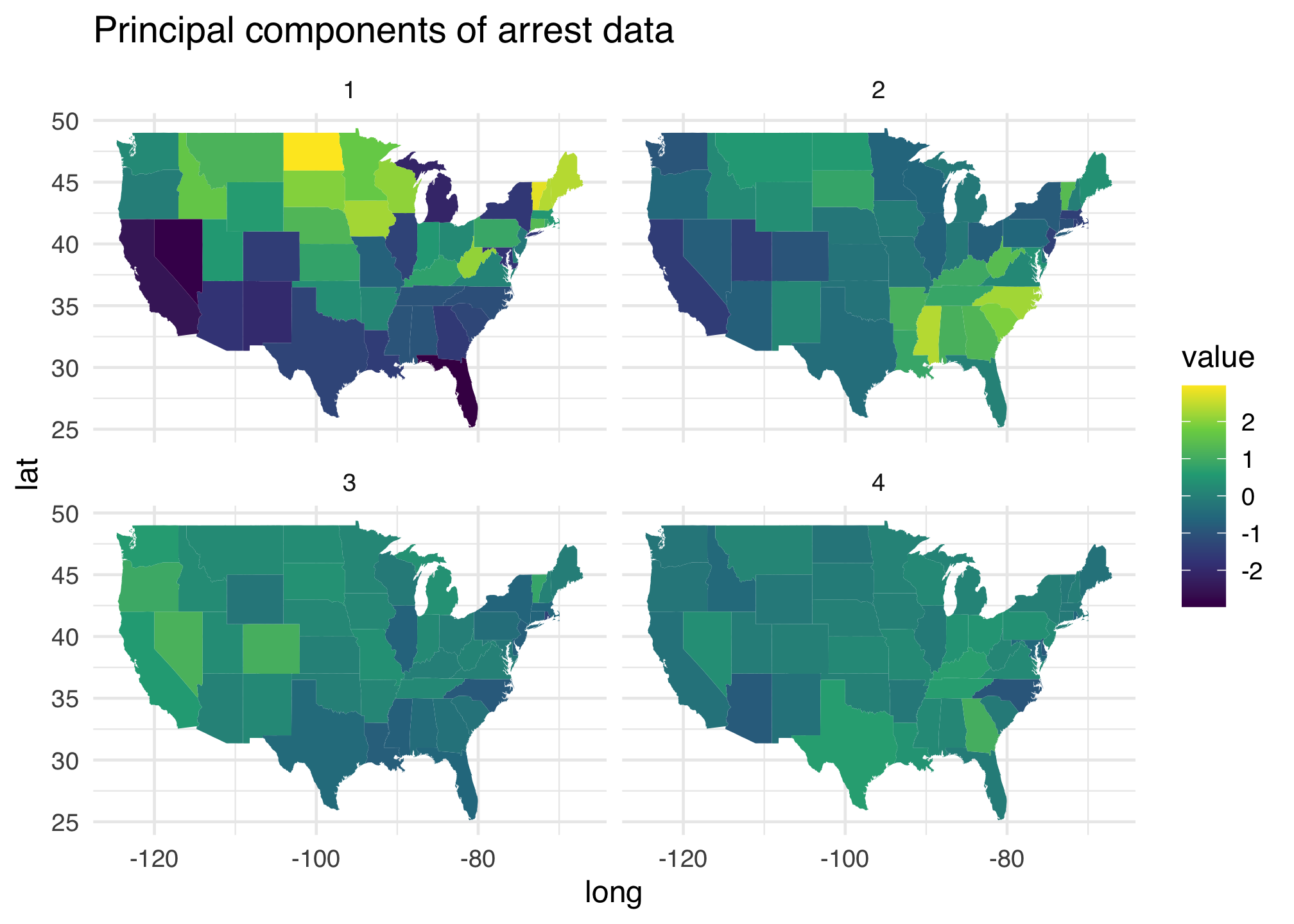 Mixing PCA and geographical information .fl.w-50[ ```r require("maps") pc %>% broom::tidy(matrix = "samples") %>% mutate(region = tolower(row)) %>% inner_join(map_data("state"), by = "region") %>% ggplot() + aes(long, lat) + aes(group = group, fill = value) + geom_polygon() + facet_wrap(~PC) + scale_fill_viridis_c() + ggtitle("Principal components of arrest data") ``` ] .fl.w-50[  ] --- ###