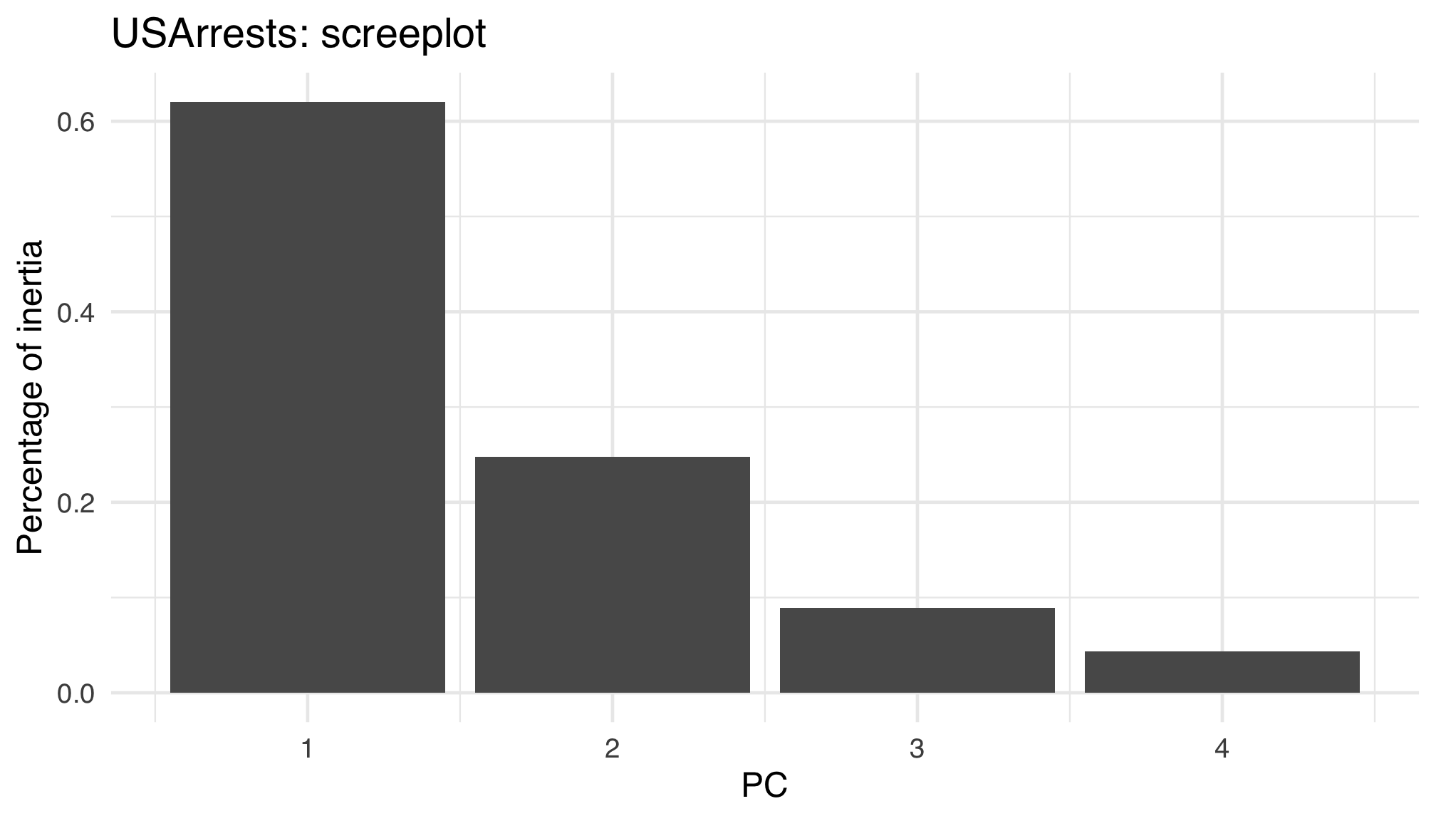 `tidy` for class `prcomp` .fl.w-50[ ```r # information about singular values broom::tidy(pc, "pcs") %>% knitr::kable() ``` <table> <thead> <tr> <th style="text-align:right;"> PC </th> <th style="text-align:right;"> std.dev </th> <th style="text-align:right;"> percent </th> <th style="text-align:right;"> cumulative </th> </tr> </thead> <tbody> <tr> <td style="text-align:right;"> 1 </td> <td style="text-align:right;"> 1.5748783 </td> <td style="text-align:right;"> 0.62006 </td> <td style="text-align:right;"> 0.62006 </td> </tr> <tr> <td style="text-align:right;"> 2 </td> <td style="text-align:right;"> 0.9948694 </td> <td style="text-align:right;"> 0.24744 </td> <td style="text-align:right;"> 0.86750 </td> </tr> <tr> <td style="text-align:right;"> 3 </td> <td style="text-align:right;"> 0.5971291 </td> <td style="text-align:right;"> 0.08914 </td> <td style="text-align:right;"> 0.95664 </td> </tr> <tr> <td style="text-align:right;"> 4 </td> <td style="text-align:right;"> 0.4164494 </td> <td style="text-align:right;"> 0.04336 </td> <td style="text-align:right;"> 1.00000 </td> </tr> </tbody> </table> ```r broom::tidy(pc, "pcs") %>% ggplot() + aes(x=as.integer(PC), y=percent) + geom_col() + xlab("PC") +ylab("Percentage of inertia") + ggtitle("USArrests: screeplot") ``` ] .fl.w-50[ With `matrix="pcs"` or `matrix="eigen"`, we obtain a tibble that is convenient for generating a `screeplot` It contains the information returned by `summary(pc)` Indeed, column `percent` is obtained by squaring column `std.dev` and normalizing the column  ] ??? See `sloop::s3_get_method(tidy.prcomp)` or ```r as_tibble(pc$sdev) %>% rename(std.dev=value) %>% rownames_to_column("PC") %>% mutate(PC=as.integer(PC), percent=(std.dev^2/sum(std.dev^2)), cumulative=cumsum(percent)) # or t(summary(pc)$importance) %>% data.frame() %>% rownames_to_column() ``` --- ### Package `broom`