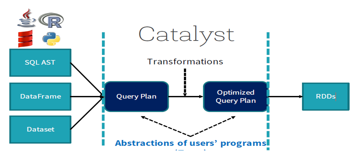Catalyst helps to move from an unoptimized logical query plan to an optimized physical plan
