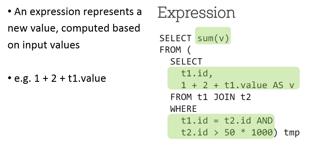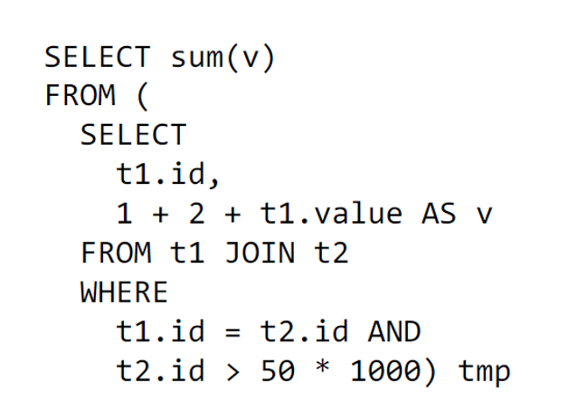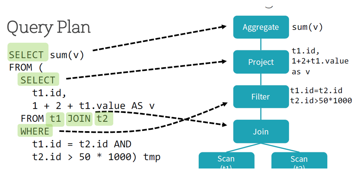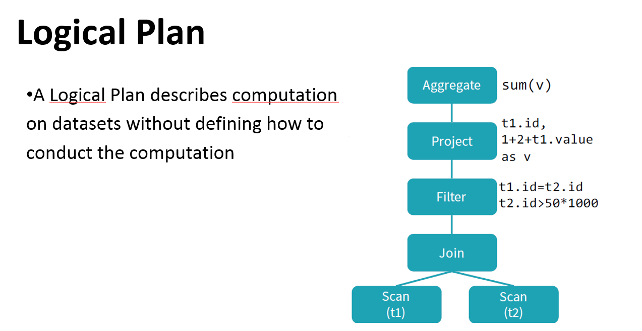 Logical plan: series of algebraic or language constructs, for example: SELECT, GROUP BY, UNION, etc. Usually represented as a DAG where nodes are the constructs.