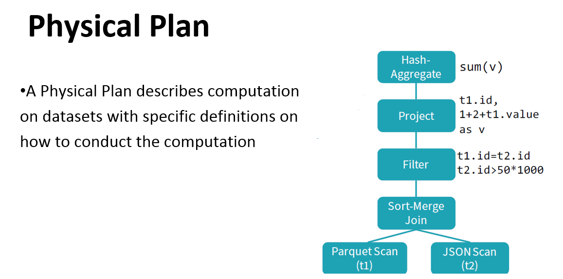 Physical plan: similar to the logical plan, also represented by a DAG but concerning low-level operations (operations on RDDs).