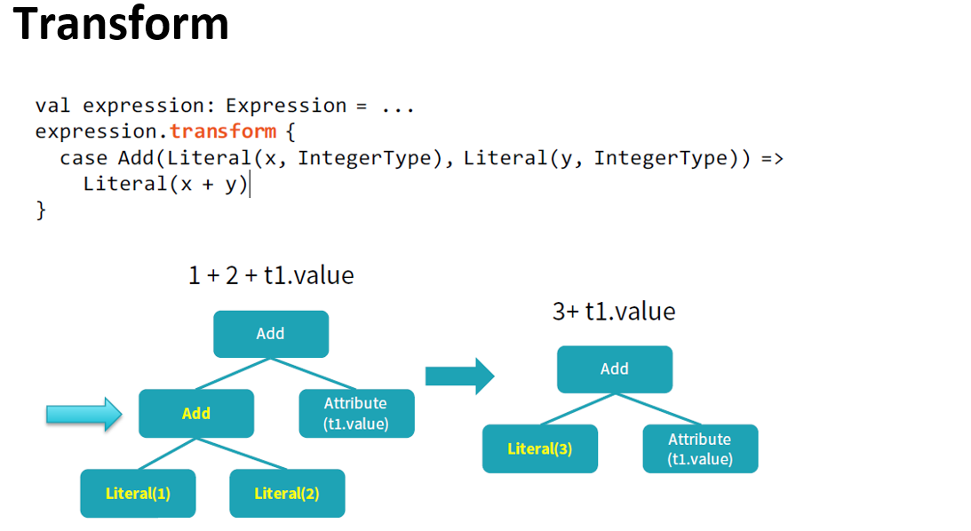 Catalyst makes use of some powerful functional programming features from Scala to allow developers to concisely specify complex relational optimizations.