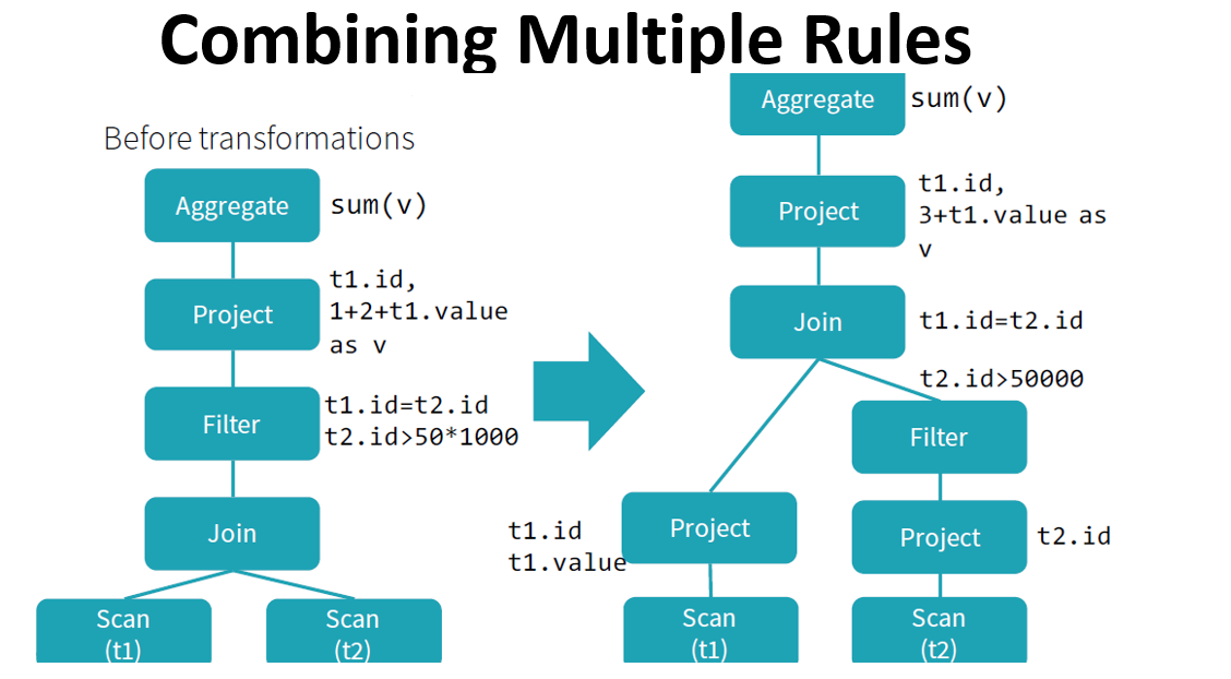 Try to optimize logical plan through predefined rule-based optimizations. Some optimizations are: