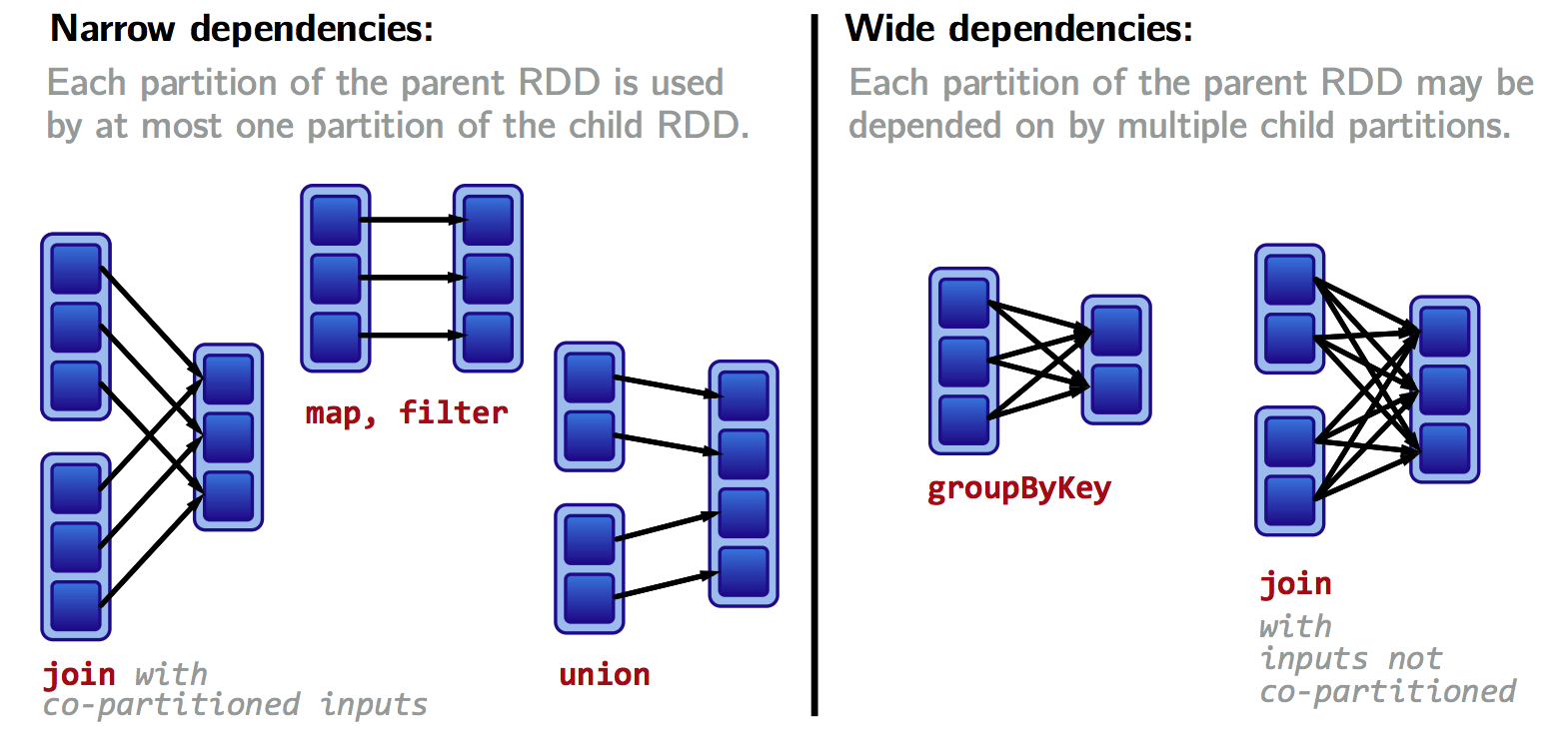 cogroup, groupWith, join, leftOuterJoin, rightOuterJoin, groupByKey, reduceByKey, combineByKey, distinct, intersection, repartition, coalesceThese list are usually correct, but as seen above for join, a correct answer depends on lineage
