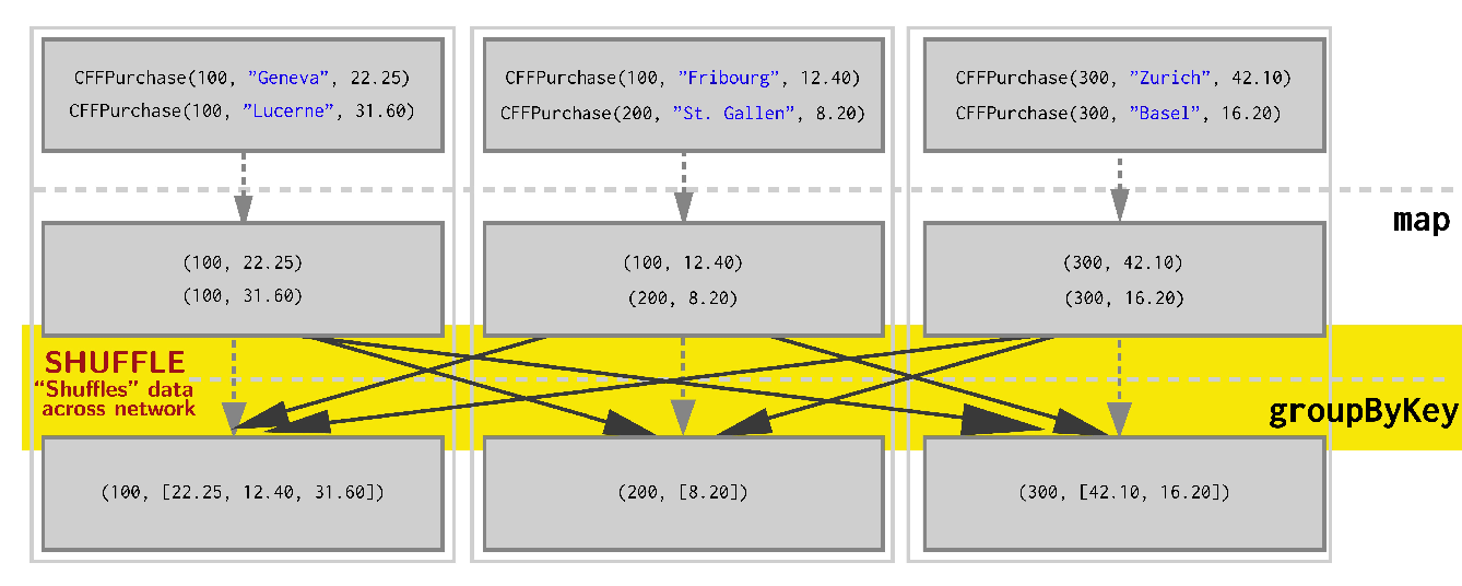 Given a Pair RDD that should be grouped, groupByKey first computes per tuple (k,v) its partition p: