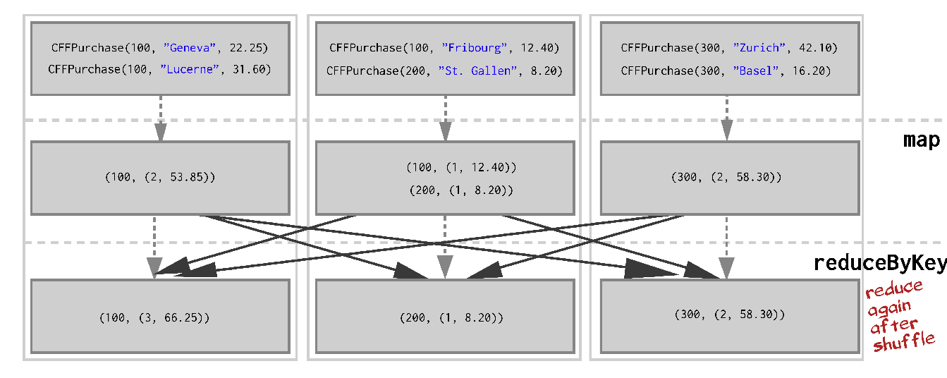 [(100, (4, 92.95)), (101, (2, 39.8))]How would this looks on a cluster? (imagine that the dataset has millions of purchases)