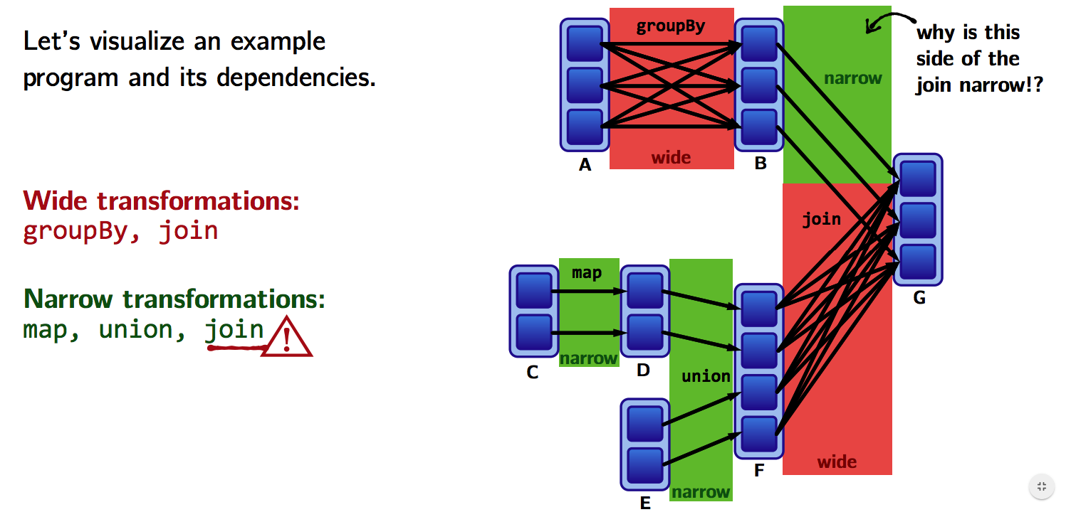 join is narrow because groupByKey already partitions the keys and places them appropriately in B.join operations can be narrow or wide depending on lineageTransformations with (usually) narrow dependencies: