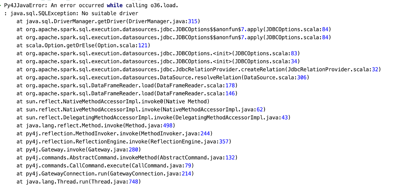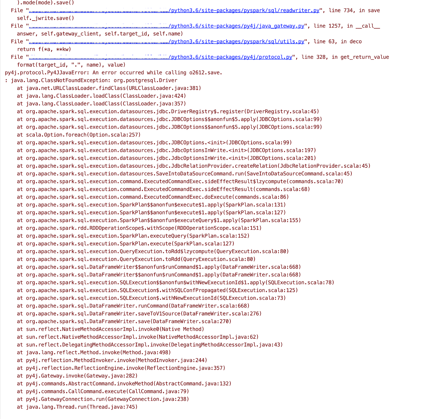 "ClassNotFoundException": usually when you are trying to connect your application to an external a database. Here is an exampleMeans that Spark cannot find the necessary jar driver to connect to the database